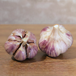Originally from the Republic of Georgia, Metechi is a striking late-season garlic known for its vigor in the field and boldness on the plate. With tall, upright growth and broad leaves, it stands out even before harvest. The bulbs are eye-catching, with purple-marble wrappers and 4 to 5 hefty cloves inside—perfect for cooks who like substance and spice.